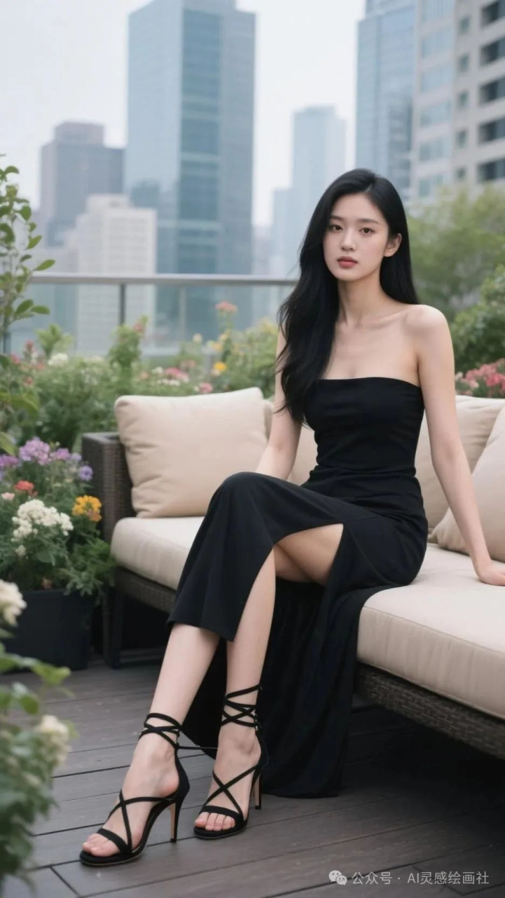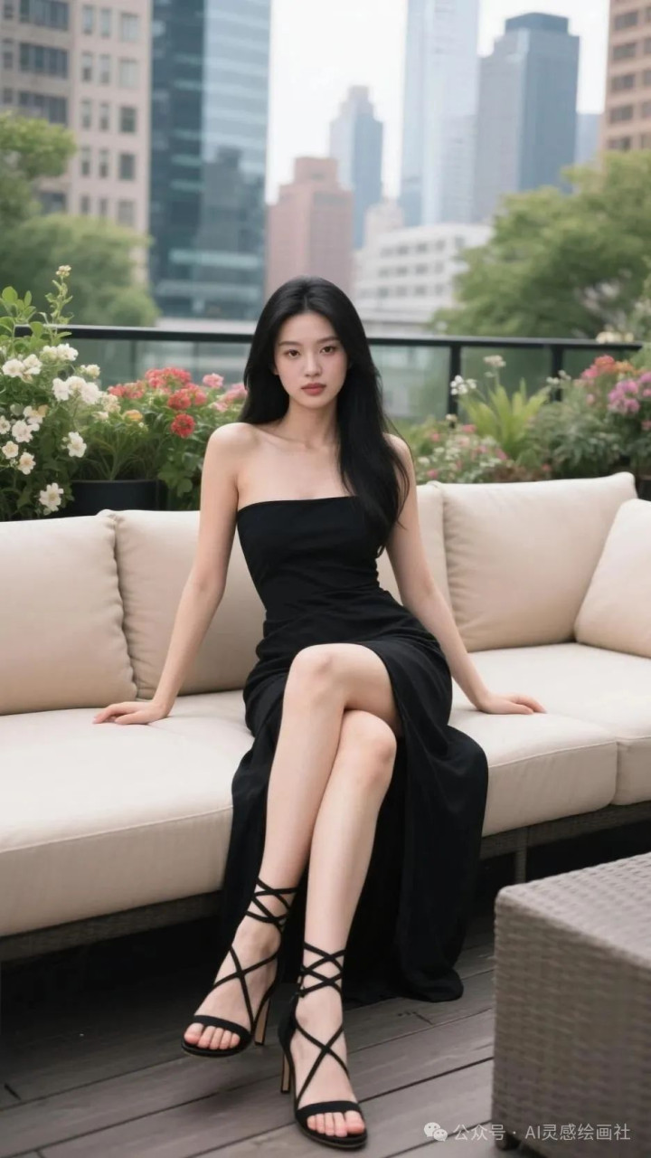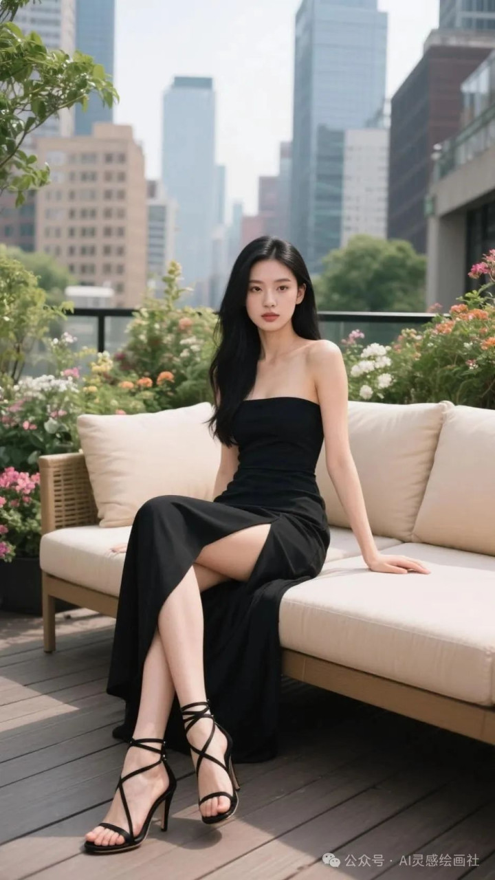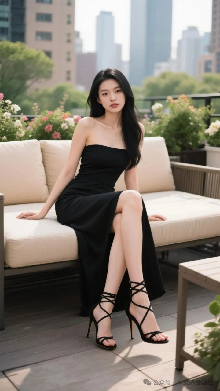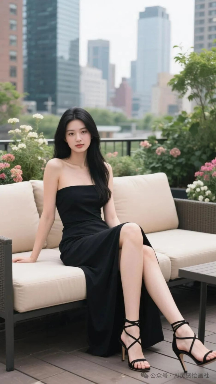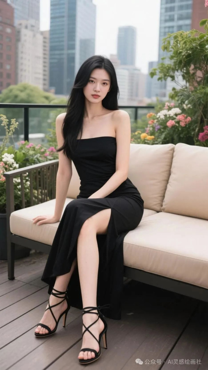 高挑美女, 完美身材, 黑色抹胸裙, 都市露台的时尚定格